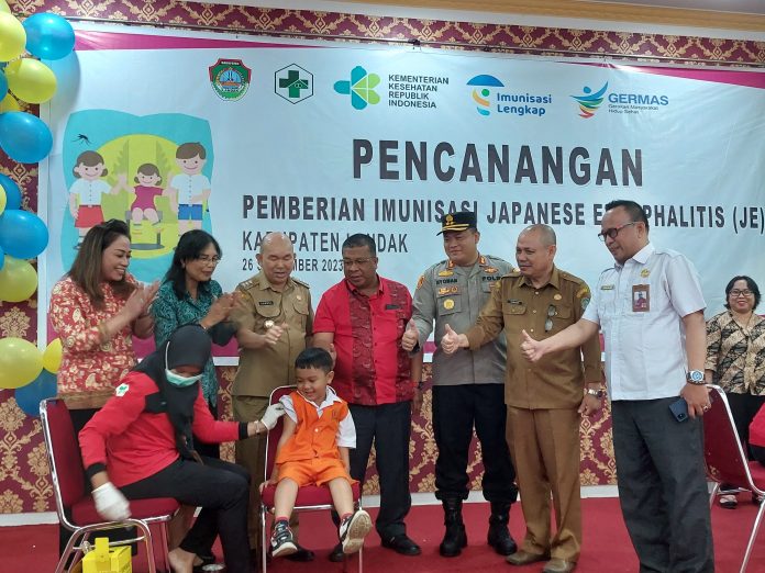 LANDAK – Pemerintah Kabupaten Landak melalui Dinas Kesehatan Kabupaten Landak melaksanakan pencanangan imunisasi japanese encephalitis (JE) dengan sasaran anak usia 9 bulan sampai dengan kurang dari 15 tahun yang dilaksanakan di Aula Kantor Bupati Landak, Selasa (26/09/2023).