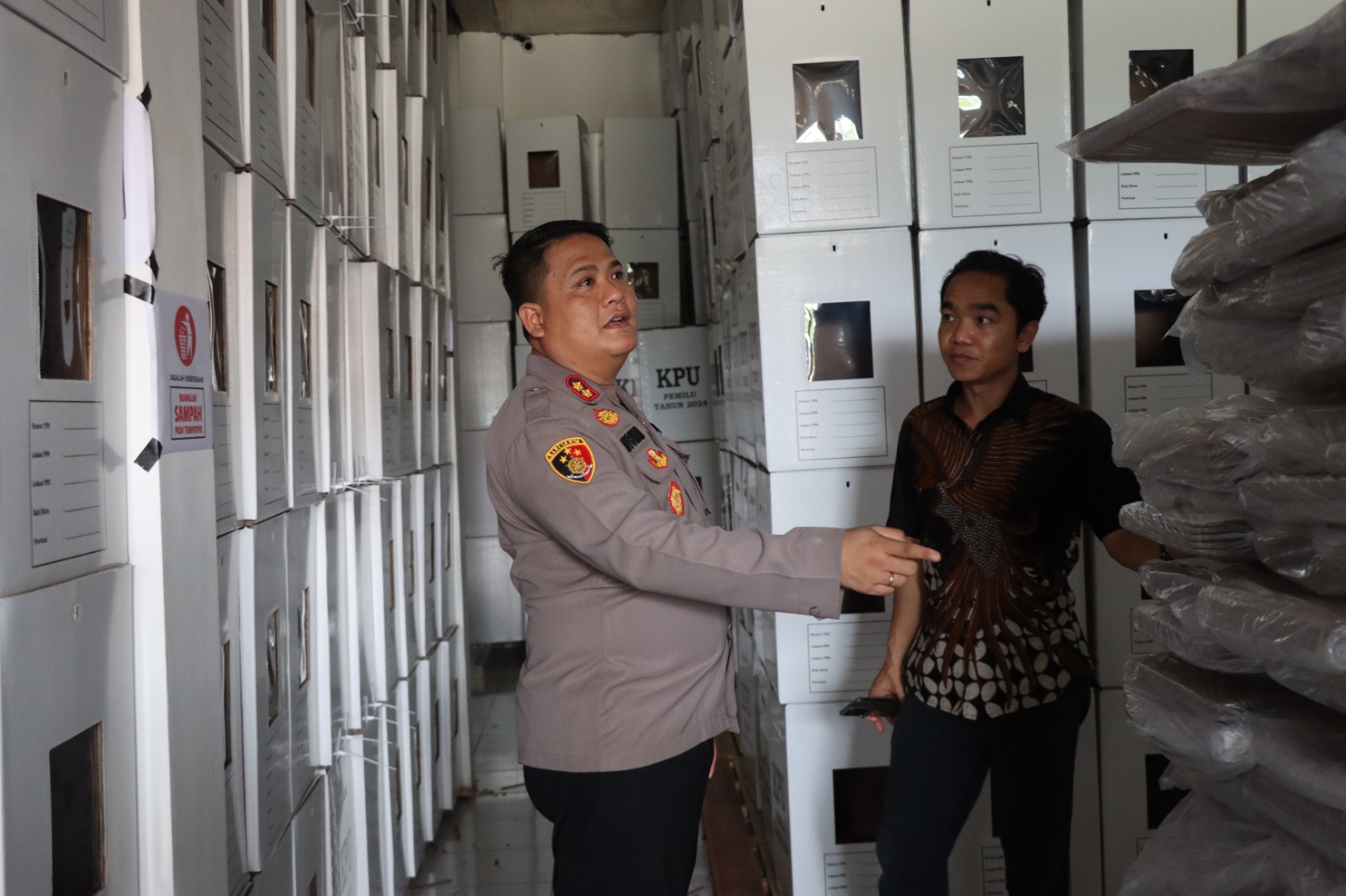 Selama pengecekan, AKBP Nyoman juga berinteraksi langsung dengan petugas KPU yang bertanggung jawab atas gudang logistik.
