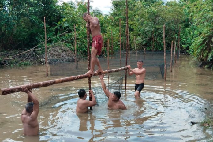 Dalam kegiatan tersebut, para personel terlihat bahu membahu membangun keramba mulai dari penataan kayu hingga pemasangan jaring ikan secara bertahap.