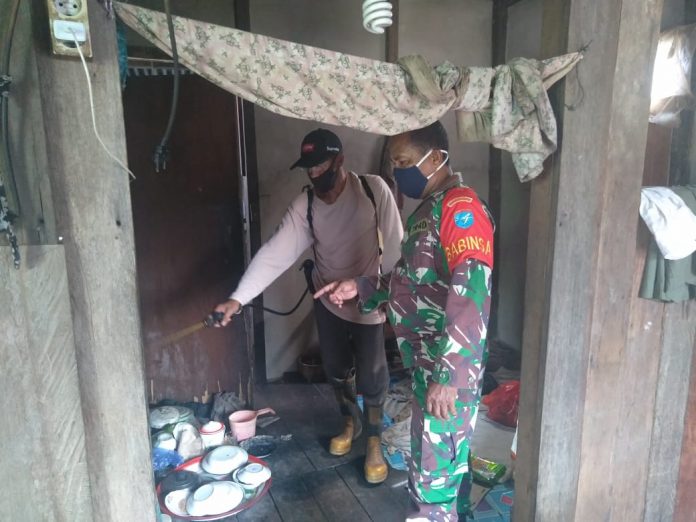 AIR BESAR- Guna memutus mata rantai penyebaran covid -19, Koramil 1201-12/Air Besar bersama forkopimcam Air Besar melakukan penyemprotan disinfektan ke rumah warga Desa Serimbu Tengah, Kecamatan Air Besar, Kabupaten Landak yang meninggal diduga akibat terkonfirmasi positif covid-19, Sabtu (19/6/2021).