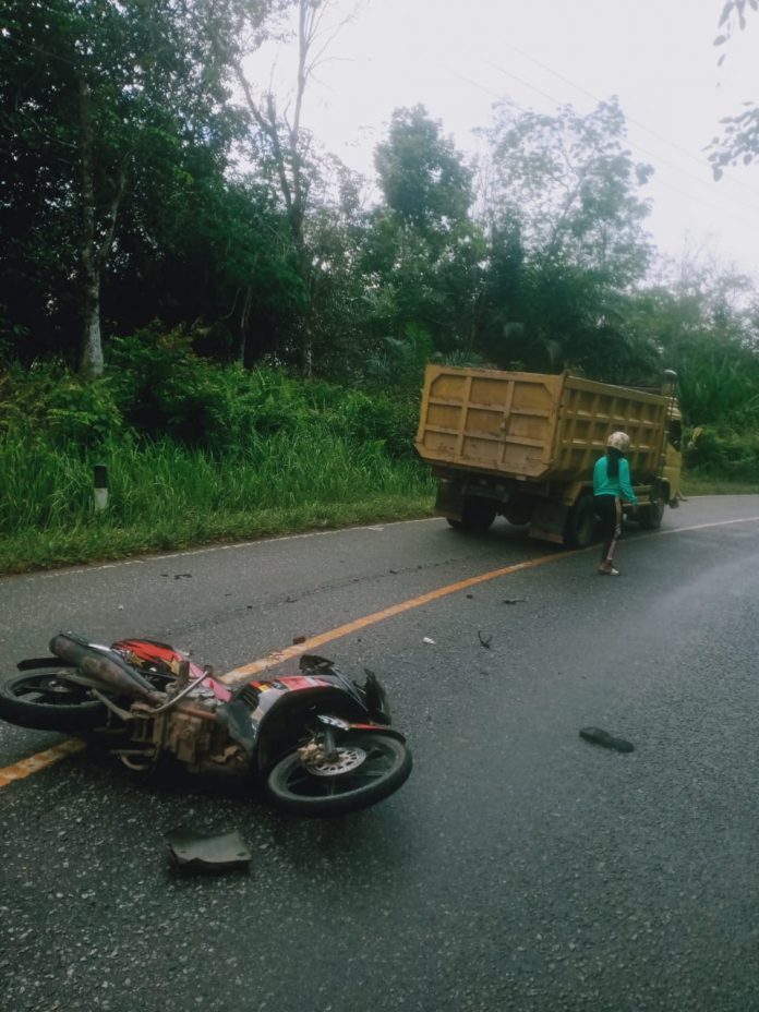 SENGAH TEMILA- Peristiwa kecelakaan lalu lintas melibatkan sepeda motor dengan nomor Polisi KB 5732 TY dan mobil dump truck dengan nomor Polisi KB 9874 EF terjadi di Jalan Raya Pontianak-Ngabang, Dusun Runut, Desa Tonang, Kecamatan Sengah Temila Kabupaten Landak Rabu (22/6/2022).