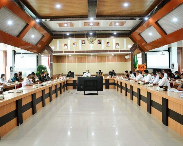 KETAPANG- Bupati Ketapang Martin Rantan yang diwakili Sekretaris Daerah Kabupaten Ketapang Alexander Wilyo memimpin rapat koordinasi pencegahan penularan COVID-19 varian Omicron di Kabupaten Ketapang, Rabu (09/02/2022).