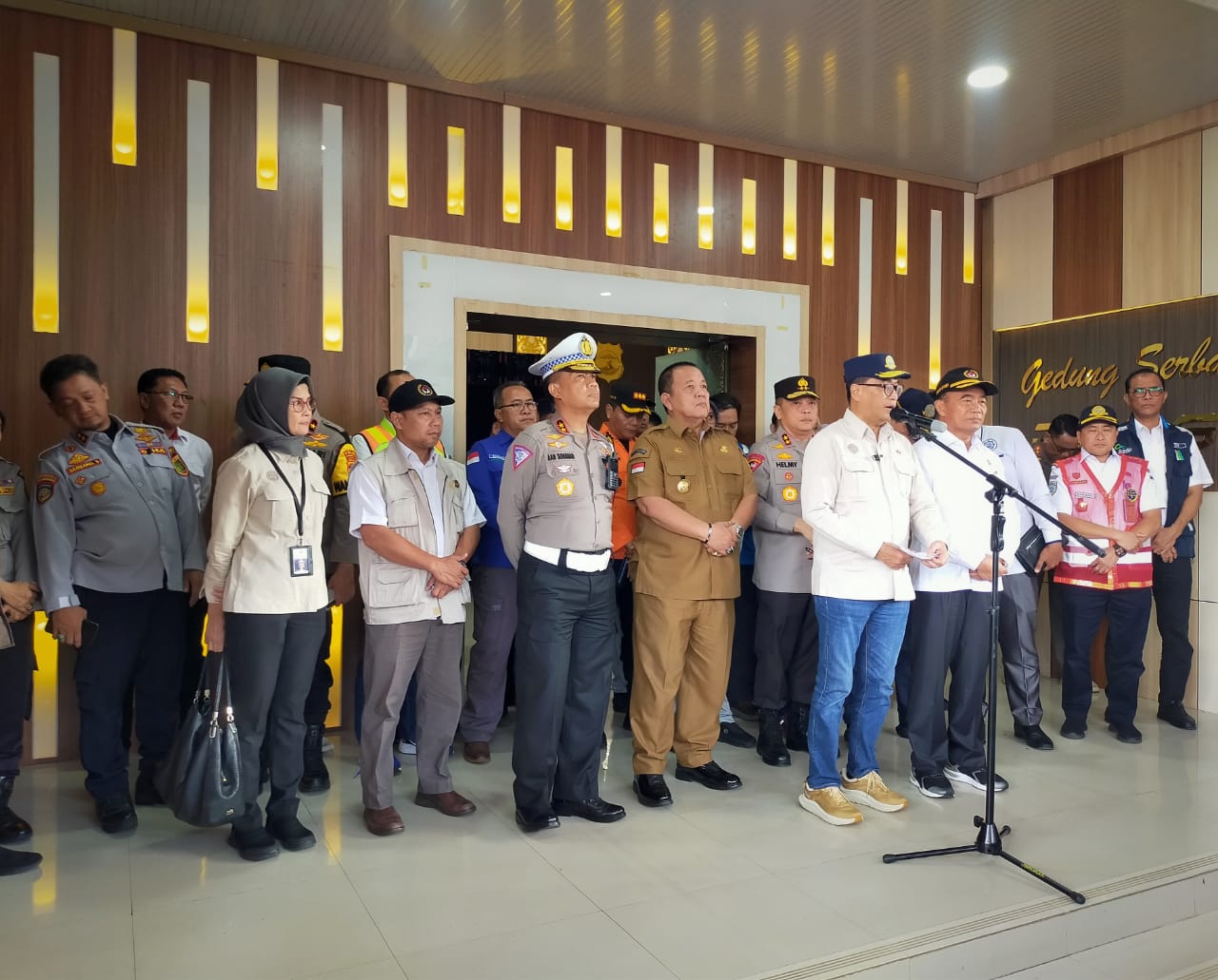 BANDAR LAMPUNG – Gubernur Lampung Arinal Djunaidi mendampingi Menteri Koordinator Bidang Pembangunan Manusia dan Kebudayaan (Menko PMK) Muhadjir Effendy dan Menteri Perhubungan Budi Karya Sumadi dalam rapat koordinasi dalam rangka penanganan arus balik mudik Idul Fitri 1445 H bertempat di GSG Presisi Polda Lampung, Jum’at (12/04/2024).