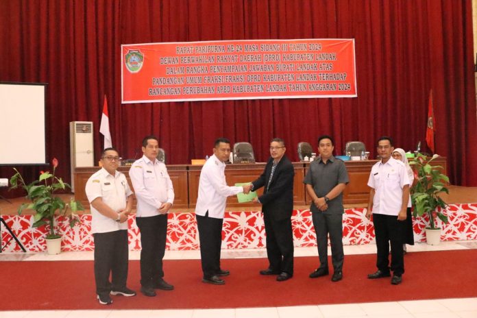 LANDAK – Pj. Bupati Landak Gutmen Nainggolan menghadiri rapat paripurna ke-24 masa sidang III Tahun 2024 yang digelar DPRD Kabupaten Landak dalam rangka penyampaian jawaban Bupati Landak atas pandangan umum fraksi-fraksi DPRD terhadap rancangan perubahan APBD Kabupaten Landak Tahun Anggaran 2024, di aula Kantor DPRD Landak, Rabu (28/08/2024).