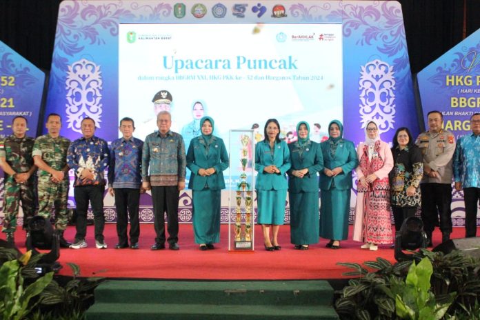 PONTIANAK- Tim Penggerak PKK Kabupaten Landak berhasil meraih juara umum setelah mendapat peringkat pertama di dua katagori lomba yaitu lomba panduan suara dan cerdas cermat serta juara harapan di katagori masak pangan lokal di acara HKG-PKK ke-52 dengan tema “Bergerak Bersama PKK, Mewujudkan Keluarga Sejahtera” di Pontianak, Kalimantan Barat, Kamis (25/04/2024).