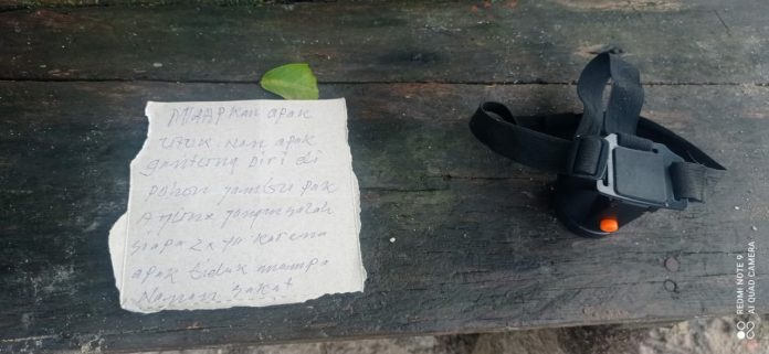 Berdasarkan hasil identifikasi awal di TKP polisi menemukan senter kepala dan sandal jepit yang diduga milik korban serta secarik kertas yang berisikan permohonan maaf korban.