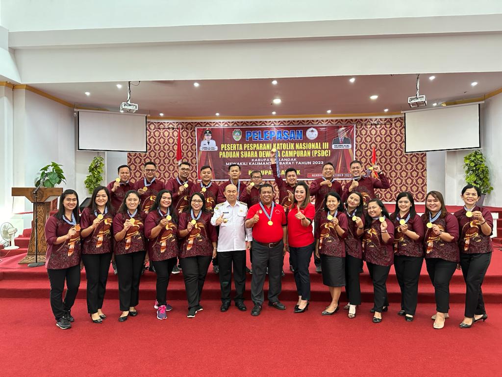 LANDAK – Pj. Bupati Landak Samuel melepas keberangkatan peserta Paduan Suara Dewasa Campuran (PSDC) Kabupaten Landak yang akan mengikuti kegiatan Pesparani Nasional III di DKI Jakarta Tahun 2023 untuk mewakili Kalimantan Barat, Rabu (25/10/2023).