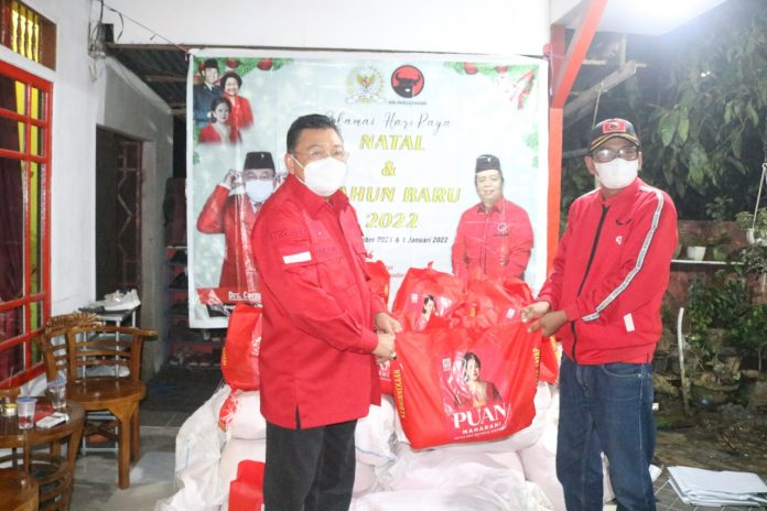 SINGKAWANG- Kunjungan Kerja dalam masa reses di Kota Singkawang dan Kabupaten sambas Anggota DPR RI Komisi II dan Badan anggaran DPR RI, Tim pengawas DPR RI, Bidang Pengawasan Perbatasan Fraksi PDI Perjuangan Daerah Pemilihan Kalimatan Barat 1 Cornelis, bagikan paket sembako kepada masyarakat Singkawang dan Sambas, Senin (3/1/2022).