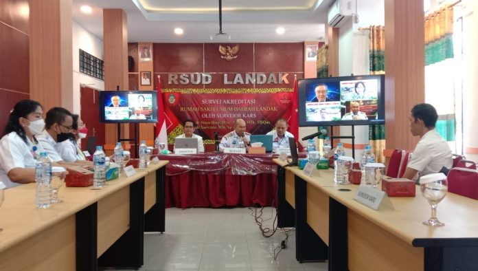 LANDAK – Pj. Bupati Landak Samuel, menghadiri kegiatan Survei Akreditasi Rumah Sakit Umum Daerah Landak oleh Surveior KARS melalui Zoom Meeting, di RSUD Landak, Rabu (25/10/2023).