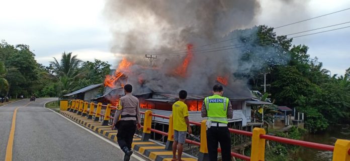 LANDAK- Peristiwa kebakaran menghanguskan 1 unit rumah yang juga dijadikan tempat usaha kedai minuman di Desa Tubang Raeng, Kecamatan Jelimpo, Kabupaten Landak Senin (19/7/2021). Sekitar pukul 15.30 wib sore.