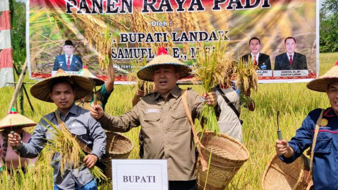 LANDAK- Pj. Bupati Landak Samuel menghadiri kegiatan panen raya padi sekaligus penyerahan alsintan berupa handtraktor secara simbolis kepada poktan dan penyerahan santunan jaminan kematian kepada para petani Kabupaten Landak, di Desa Agak, Kecamatan Sebangki, Kabupaten Landak. Rabu (08/03/2023).