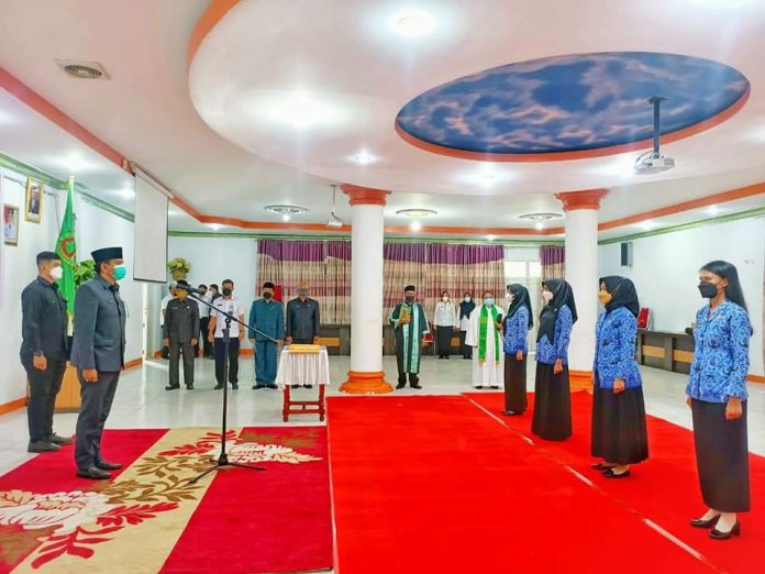 KETAPANG- Bupati Ketapang Martin Rantan yang diwakili Asisten Sekda Bidang Pemerintahan dan Kesejahteraan Rakyat Edi Radiansyah melantik dan mengambil sumpah janji jabatan fungsional Surveyor Pemetaan Ahli Pertama dan jabatan fungsional Pengelolaan Barang/Jasa Pertama di lingkungan Setda Kabupaten Ketapang, Rabu (23/02/2022).