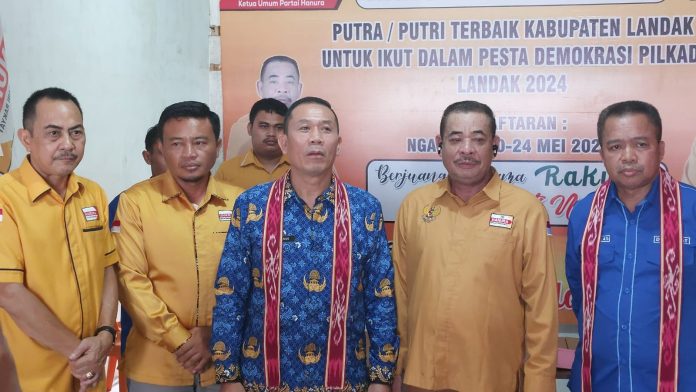 LANDAK – Sekretaris Daerah Kabupaten Landak, yang juga bakal calon Bupati Landak Vinsensius didampingi bakal calon Wakil Bupati Landak Markus Amid menyerahkan berkas pendaftaran bacalon Bupati dan bacalon Wakil Bupati untuk mengikuti konstetasi pilkada Landak ke DPC Partai Hanura Kabupaten Landak, Senin (20/05/2024).